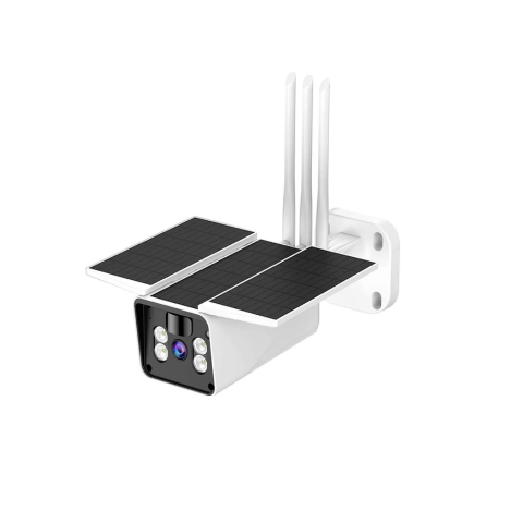 Wire-free power: 5 W solar panel + 4×18650 (10,400 mAh) battery pack; external adapter optional.
